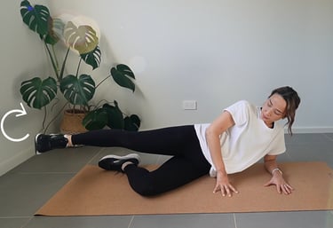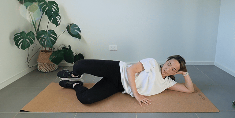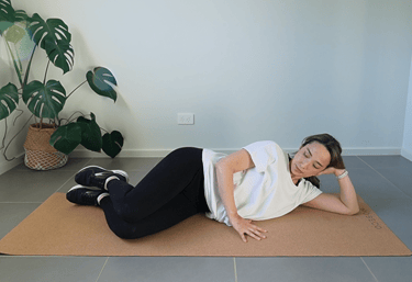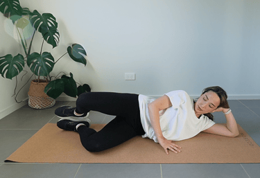 Lay on your side with your knees bent, your hips stacked & your heels touching